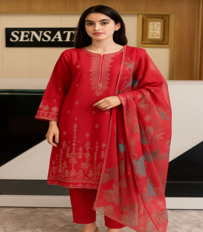 Stitched 3-Piece Contrast Thread Embroidered Dress for Women