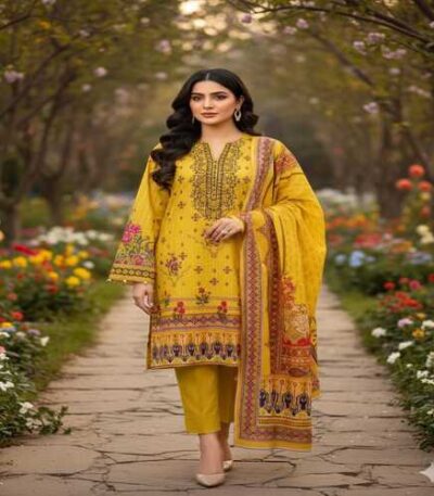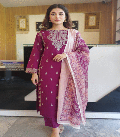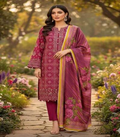 3-Piece Embroidered Lawn Suit with Chiffon Dupatta – Unstitched